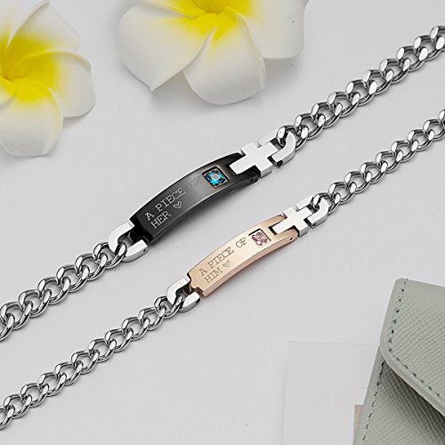-. Feature : 1/ A PIECE OF HIM (HER), 2/ HERS FOREVER & HIS ALWAYS ,3/ HER BEAST & HIS BEAUTY, 4/ HIS QUEEN & HER KING , 5/ HIS DOE & HER BUCK 6/ I LOVE YOU MORE (MOST) ,7/ MY SUN AND STARS & MOON OF MY LIFE , 8/ YOU ARE MY PERSON. / Material : Titanium Stainless steel Bracelet not fade,Hypoallergenic and Allergy free, Laser Cutting and Polishing Technique. AAA cubic zirconia keep it stunning,safe for skin.use environment friendly material. / Size : Women Bracelet: 7.3"(18.5 cm); Rose Gold Color;Writes His queen/ Men bracelet:8.6"(22 cm); Black color ,Writes Her king,Adjustable,Fit for Most Men And Women. / Love Gift :Sweet Design for each couples, engrave the promise words, can be as a love gift. Best present for Couples, Parents, Newlyweds, Birthday, Anniversary, Valentine's day etc. / Service: 90-Day Money Back Guarantee or Exchange. We Try to Provide Best Shopping Experience for You.