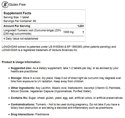 -. Feature : Longvida Optimized Curcumin Extract (from Curcuma longa root) - 1,000 mg per tablet / Longvida Curcumin is 65 times more bioavailable than regular curcumin / Gluten free, Sugar free, Yeast free, Egg free / Support cognition, memory & overall health* / Serving Size: 1 tablet. Servings per Container: 60.
