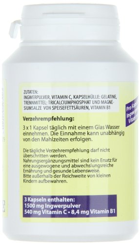 -. Feature : Nahrungsergänzungsmittel mit 500mg Ingwerpulver, 180mg Vitamin C und 2,8mg Vitamin B1 pro Kapsel / Traditionell bekannt und gut für das Wohlbefinden! / Hergestellt in Deutschland von einem zertifizierten Arzneimittelhersteller