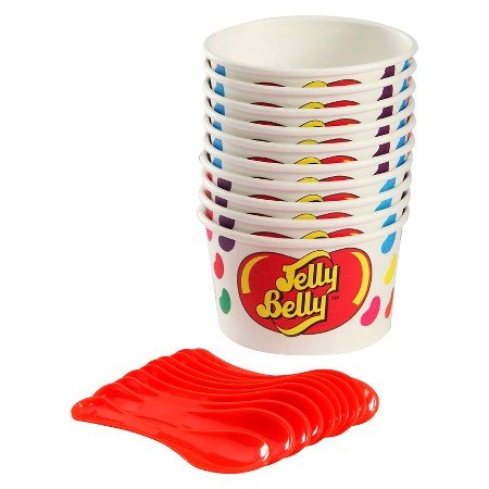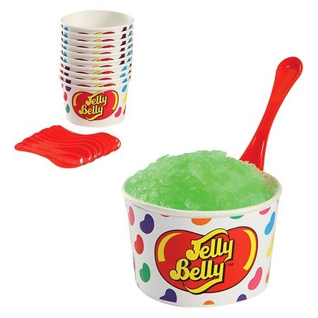 -. Feature : 10-count disposable cups and spoons with Jelly Belly design / Great for snow cones, ice cream, yogurt, desserts, and more / Easy scoop spoons / Sturdy no-tip design / Flat-bottomed cups hold 6 ounces each
