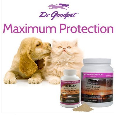 Dr. Goodpet - Maximum Protection Formula - 32 oz. (907 g) Dr. Goodpet Maximum Protection Formula provides vitamins and minerals for cats and dogs, for healthy skin, coats and bones with an irresistible chicken flavor. Ensure that your adult pets get all the nutrition they need by fortifying them with Maximum Protection Formula, the top human-quality vitamin and trace mineral powder supplement on the market. Maintain healthy skin, coat, bones, teeth and overall health, plus provide nutritional support for the immune system. Maximum Protection contains the same high-quality vitamins and minerals used in human products. It includes high levels of zinc and vitamins C and E, well-known for their many beneficial properties. The formula is further fortified with over 70 trace minerals for better digestion, growth, repair of tissues, strong bones, teeth, claws, skin and hair coat.Feature