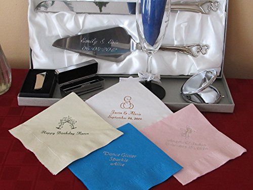 -. Brand : Presents Forever -. EAN : 0616348737418 -. Feature : Please take a look at the pics for all available colors, foils fonts and designs / Please dont' forget to email us all your personalization info. / We will P.R.Int and ship your item within 48 hours as long as we have all the personalization info. / Visit our Amazon store for other personalized items. / Please contact us if you have any additional questions P.R.Ior to your purchase. -. PackageQuantity : 100 -. ProductGroup : Kitchen -. ProductTypeName : KITCHEN -. Title : Lot Od 100 Beverage Napkins Wedding Napkins Custom Napkins Party Favors -. UPC : 616348737418