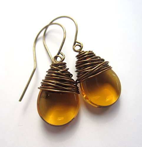 -. Title : Golden Yellow Earrings Czech Glass Wire Wrapped Drop Earrings Antiqued Brass