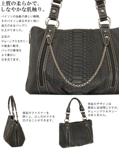 -. Feature : ■サイズ ・本体高さ24cm・横幅36cm・マチ20cm・持ち手までの長さ24cm 【素材】パイソン 【重量】950g / (No. 7072 r ) / 華やかな大人のチェーンアクセサリー。 輝く女性のパイソンタウンバッグ パイソンの独自の美しい模様。 そのパイソン革を大きく使い 迫力のあるバッグに仕上がりました。 内側は仕切りで2つに分けられていて、 その仕切りも上にファスナーがあり ポケットとして使うことができます。 他にも、携帯電話入れや小物入れ、 ファスナーポケットなど小分けに収納できる ポケットが充実しバッグの中をスッキリと保てます。