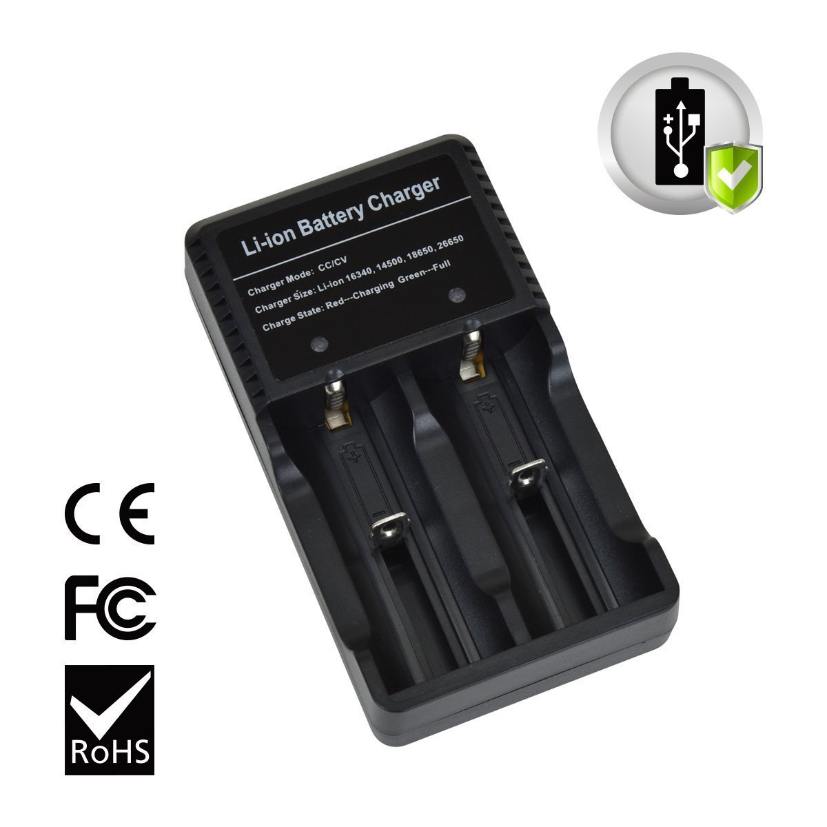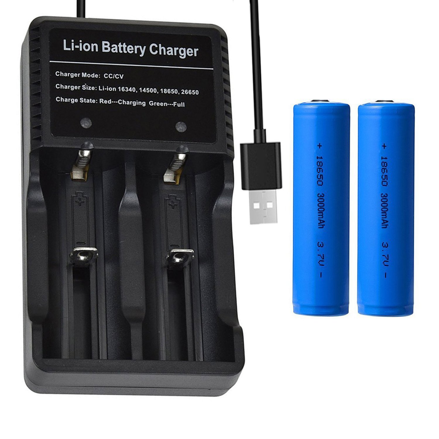 Packing specification: 18650 3.7V lithium-ion battery 2 pieces, charger 1 piece, USB charging cable 1 piece