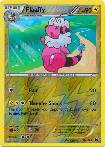 -. Binding : Toy -. Brand : Pokémon -. Edition : XY Steam Siege -. Feature : A single individual card from the Pokemon trading and collectible card game (TCG/CCG). / This is of Uncommon rarity. / From the XY Steam Siege set. / You will receive the Reverse Holo (also known as Holo Parallel Foil) version of this card. -. IsAdultProduct : 0 -. ItemPartNumber : 39/114 -. Label : Pokemon USA, Inc. -. Manufacturer : Pokemon USA, Inc. -. PackageQuantity : 1 -. ProductGroup : Toy -. ProductTypeName : TOYS_AND_GAMES -. Publisher : Pokemon USA, Inc. -. Studio : Pokemon USA, Inc. -. Title : Pokemon - Flaaffy (39/114) - XY Steam Siege - Reverse Holo