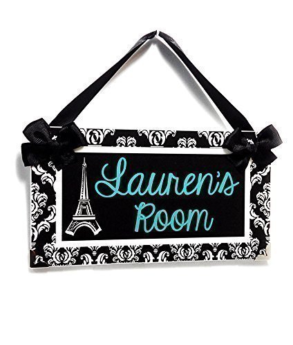 -. Title : Personalized Eiffel Tower Paris Themed Teens Room Name Door Plaque, Elegant Black and White Damask with Green Teal Text
