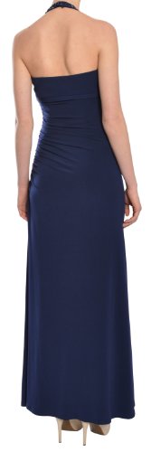 Luscious midnight blue jersey knit evening gown has fitted silhouette with asymmetrical ruching along the side and a daring side slit. Halter style neckline with fully beaded bodice and empire waist style. Side zipper closure.