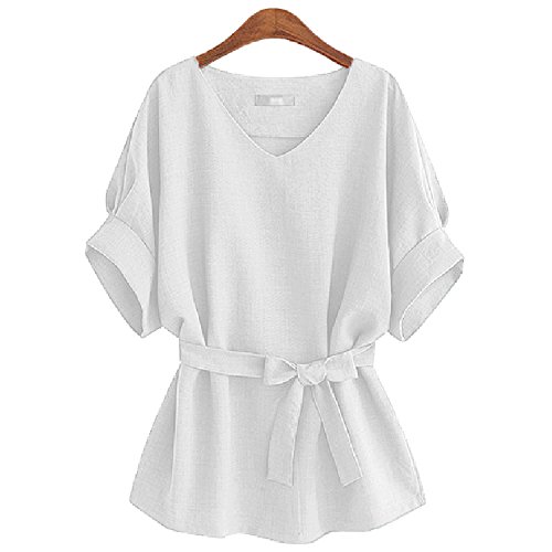 -. Title : 【HogowerU】レディース ドルマン Vネック 綿麻 カラー ブラウス 半袖 夏 Tシャツ 短袖 トップス 蝶結び飾り リボン ベルト付け