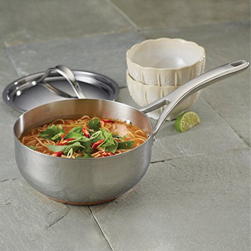 With European-inspired, tulip-shaped design - and free from sharp cookware corners - the Anolon Nouvelle Copper Stainless Steel 2-1/2-Quart Covered Saucier makes it easy to whisk sauces, melted chocolate or custards for velvety results. Beyond sauces, this convenient gourmet-quality pan is ideal for creating many delectable dishes, from risotto with ham and parmigiano-reggiano to fingerling potatoes tossed in paprika and olive oil. The saucier boasts mirror-polished stainless steel construction that's crafted with copper to deliver optimum heat control and performance. A double full cap base features a copper core layered between aluminum and magnetized stainless steel, so the saucier is compatible with all cooktops, including induction. A generously appointed cast stainless steel handle is dual riveted for strength and durability and the deep-seated stainless steel lid seals in heat and moisture. Oven safe to 500 Degree F and dishwasher safe, this covered saucier is an ideal complement to many other items in the Anolon collection. Conquer creamy custards, delicate sauces and more with the shapely, sturdy Anolon Nouvelle Copper Stainless Steel 2-1/2-Quart Covered Saucier.Feature