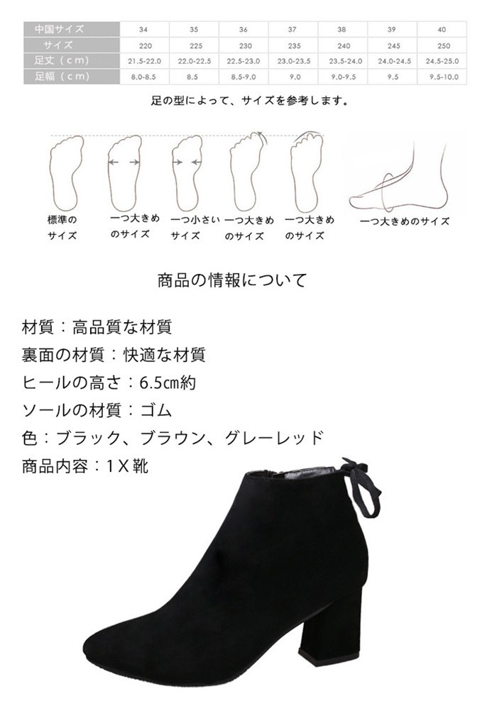 材質:高品質な材質 裏面の材質:快適な材質ヒールの高さ:6.5cm約ソールの材質:ゴム 色:ブラック、ブラウン、グレーレッド、グレー商品内容:1X靴サイズ:34:22cm 35:22.5cm 36:23cm 37:23.5cm 38:24cm 39:24.5cm 40:25cmショートブーツレディース ヒール 女性のアンクルブーツ シューズ ファスナー式靴 秋冬物 シンプル くつレディース用のアンクルブーツが登場カラーもシルエットもとても組み合わせしやすくて、どんな場合にも使える上品な一足