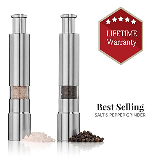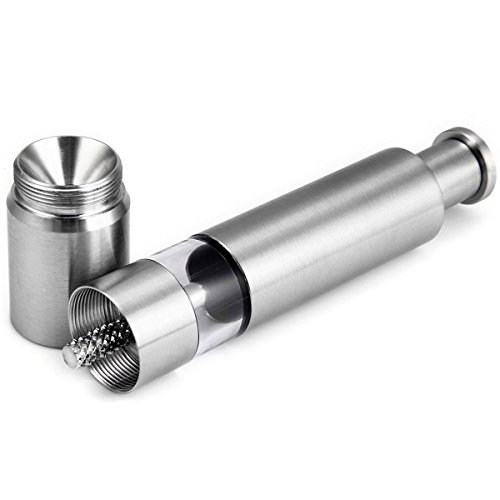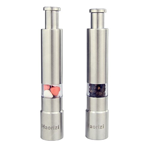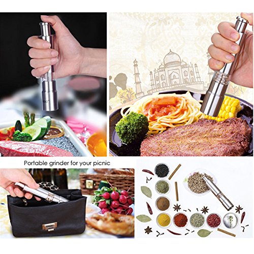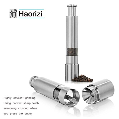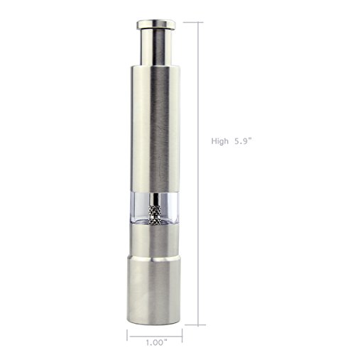 Stainless steel salt pepper mills these very stylish and elegant stainless steel mills will enhance the appearance of any dining table. The mills are made from high quality stainless steel and designed to last. Powerful grinders make this pair ideal for grinding pepper corns, rock salt, dried herbs and coarse sugar into a fine powder. Easy to use and light feature the mills are very effective and simple to use. They are lightweight, easy to fill and clean. This gives the mills a great aesthetic appeal as well as usability for special occasions like a candle lit dinner. Features: 1)Press the top to grind pepper in a simple, one-handed operation way. 2)Screw off the bottom for refilling. 3)Suitable for milling pepper, corn, mustard seed and other small sized spices. 4)Ideal gadget to make freshly ground pepper powder spice for enjoying a tasty salad or steak. 5)Material:18/8 Stainless Steel 6)Color:Silver.