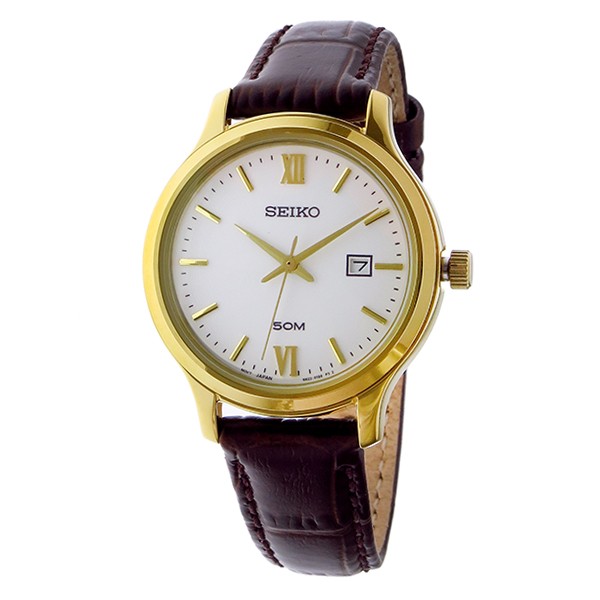 クオーツ、5気圧防水、日付カレンダー、カラー:ホワイト(文字盤)、ダークブラウン(ベルト)