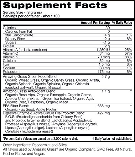Studio : Amazing Grass Publisher : Amazing Grass Binding : Grocery Product Description Our most popular blend thoughtfully combines our alkalizing farm fresh greens and wholesome fruits and veggies with nutrient-rich superfoods for a delicious way to feel amazing every day. At Amazing Grass our roots run deep...Back to our family farm in Kansas, where for over 3 generations Amazing Grass has organically grown harvested the most nutrient-dense greens on earth. Today, we thoughtfully craft our greens with the highest quality, plant-based ingredients curated from like-minded farmers from around the world. Amazing Grass products are a delicious way to nourish your body with the whole food nutrition it needs to feel amazing every day. 0