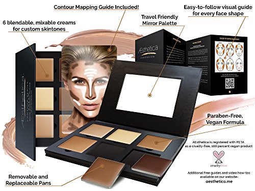 The Aesthetica Cosmetics Contour kit includes easy-to-follow, step-by-step instructions. You can now become your own professional makeup artist, even if you have never tried contouring before. Within the instruction booklet, there are many helpful tips, including a face shape diagram, that show you where to properly apply the contour and highlight, as it pertains to your facial shape. With this easy-to-follow guide, you can achieve a flawless finish, every time! The art of applying makeup requires more than just the basics. The Aesthetica Cosmetics Cream Contour Kit provides the tools you need to highlight the natural beauty of your face, while downplaying some of your problem areas.Cream Contour Kit Features: