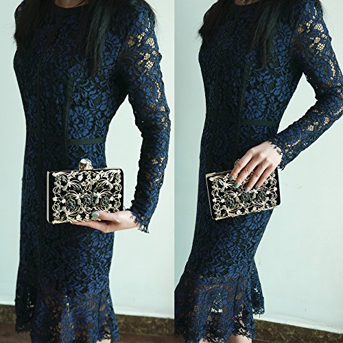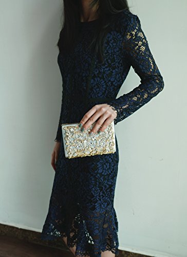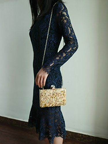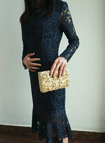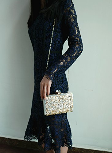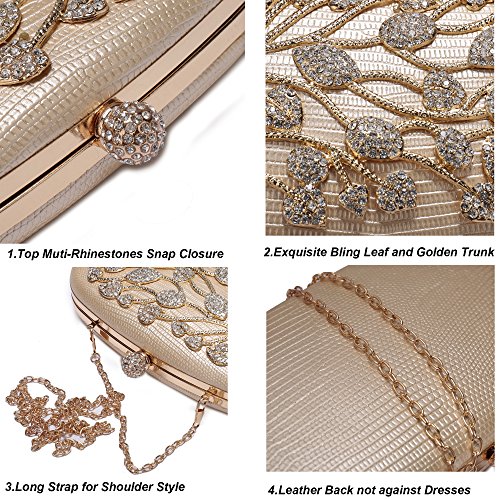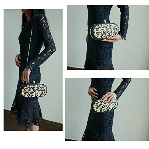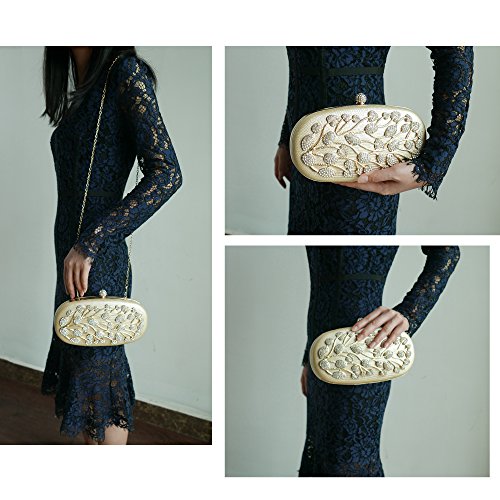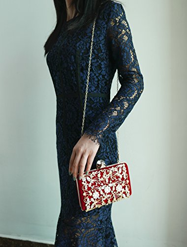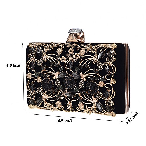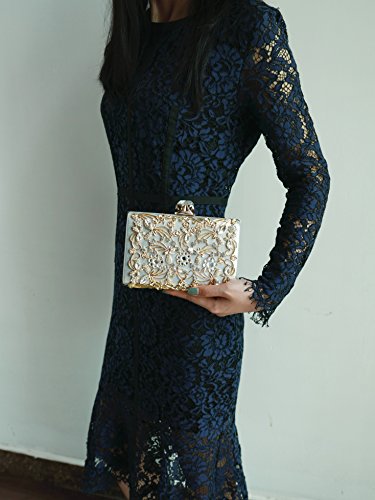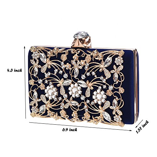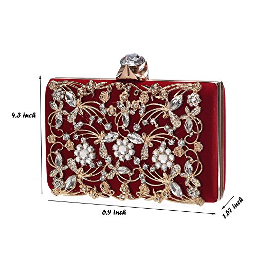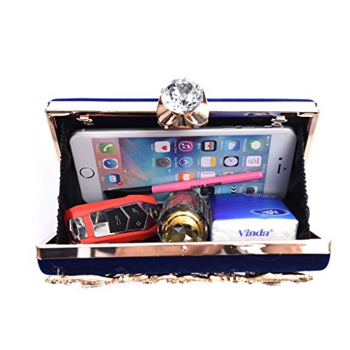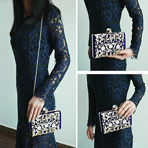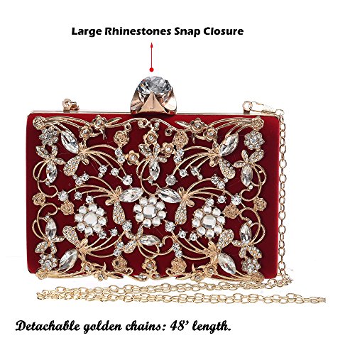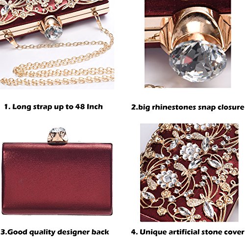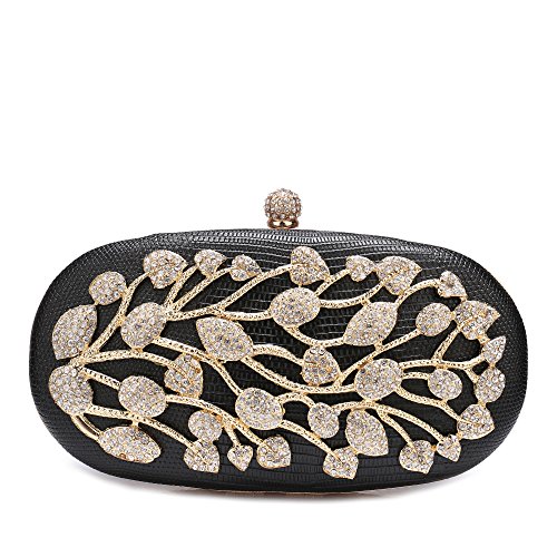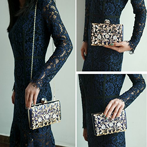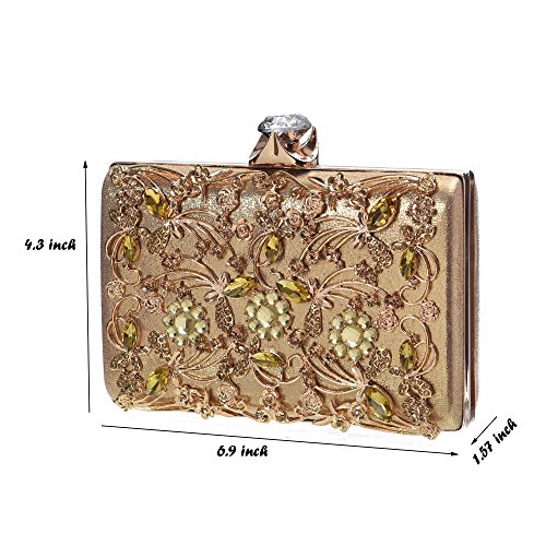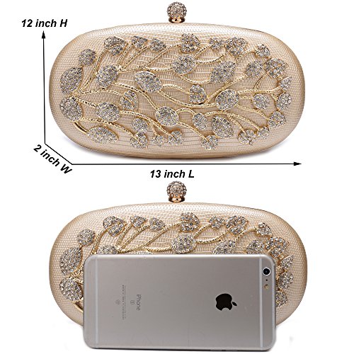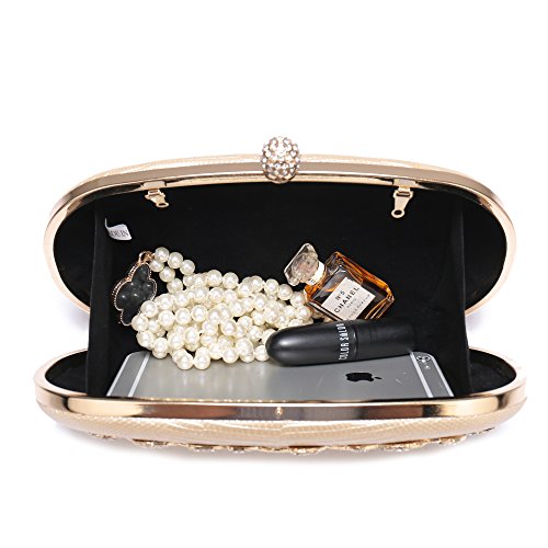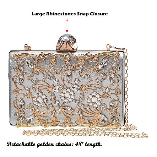 Product Description The glamorous evening party clutch features allover sparkling crystals on the front of this chic shaped clutch and has metal frame construction with clasp on the top. It features magnetic hasp closure and detachable chain which offers versatile carrying options as handbag, clutch, a shoulder bag or a cross-body bag. The crystal handbag is so royal, noble and brilliant that it will be a perfect status symbol and a bold gift for femininity.