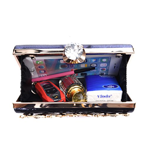 Features: 1.Covered with a fully beaded rhinestones, metal hardware and silk fabric lining. 2.Metal frame construction with clasp on the top. 3.Crystals and rhinestones ornament, add more sparkle to your dress. 4.An interior slide pocket, which is spacious enough to fit your daily essentials, such as cellphone, lipstick, compact mirror, cards, cash, cosmetic, keys. 5.Perfect for wedding party, family reunion, prom, banquet and evening cocktail party and so on . 6.Stylish: Elegant, Bling madness, Glamorous, Fashionable. Notes: 1. With the difference in measurement method, please allow 0.1-1 inches in size and weight deviation. 2. There might be slightly difference in color, because of the computer monitor settings. 3. It can't avoidable that you will receive the clutch with some smells from original material as it's brand new. But the smell will be gone if place the clutch in freely circulating air for 1-2 days." 0
