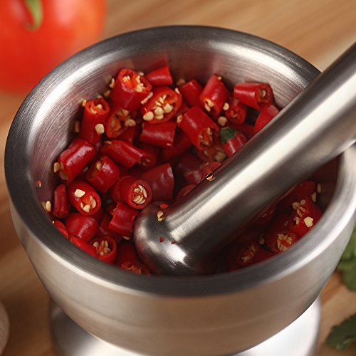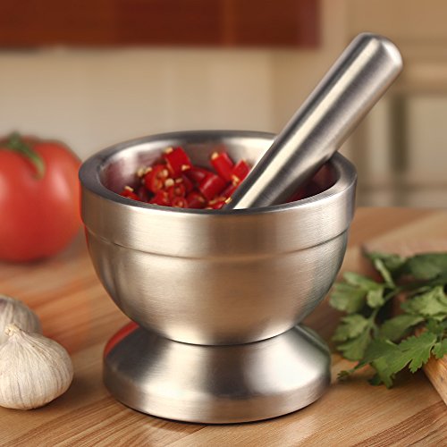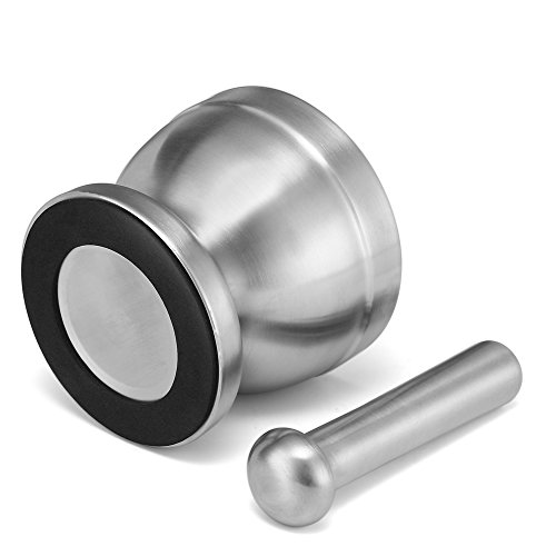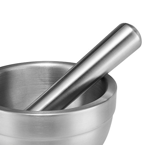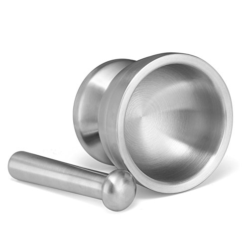 - Brushed Stainless Steel mortar and pestle allows for quickly crushing spices, herbs and more; Constructed with thick walls and base to form a generous 2 cup capacity; Unpolished mortar interior-exterior and heavy duty pestle for effective grinding pressing