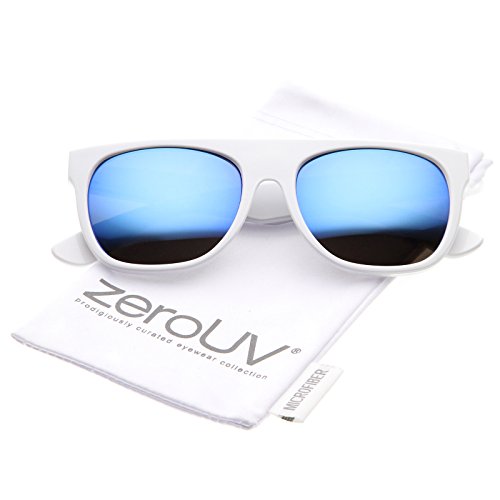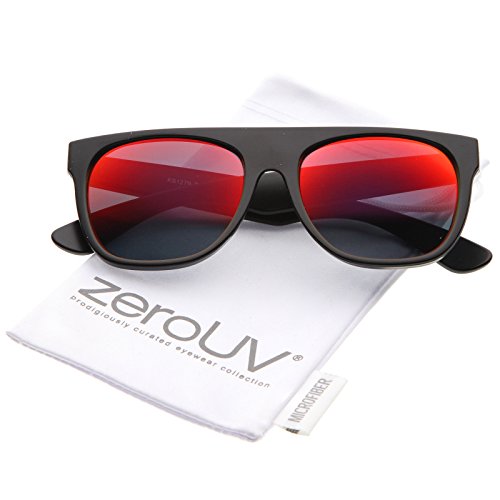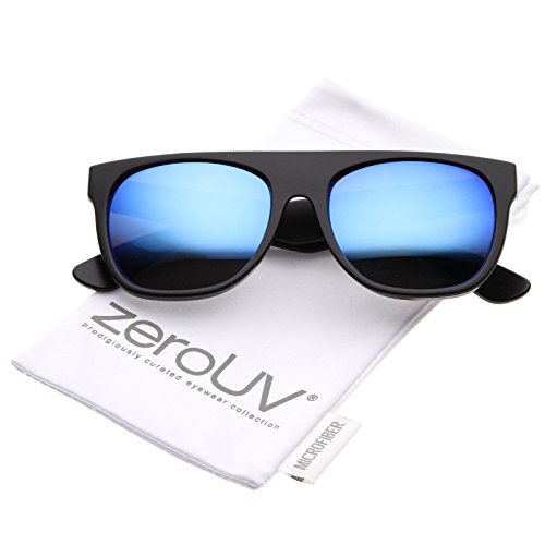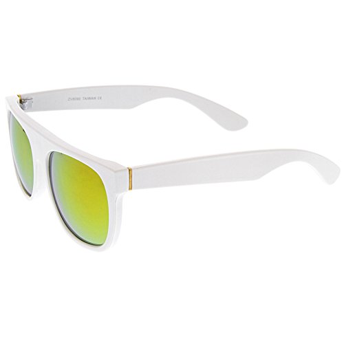A modified version of the iconic horn rimmed frame, these bold sunglasses feature a super flat top design and square colored mirror lenses. Elegant gold accents at the stylishly wide temples give these sunglasses added luxe, while straight and geometric lines give it that modern feel. Quickly becoming one of our most popular styles, these horn rimmed sunglasses are an accessory must-have. Made with a plastic based frame, metal hinges, and reflective UV400 protected lenses. Lens Height: 43 mm | Lens Width: 55 mm | Bridge: 16 mm | Frame Total: 140 mmFeature