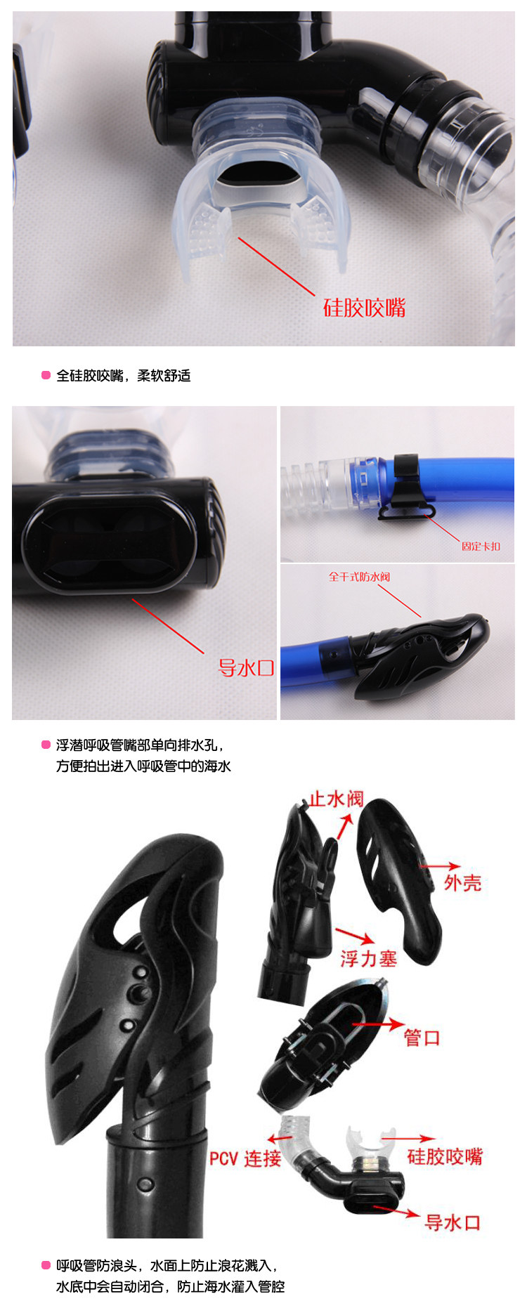 管扣可快速调节,方便同面镜的卸带;高级进口矽胶原料无毒,抗海水腐蚀,无过敏柔韧性好;全干式具有多个国家及地区专利的防浪上排头及下排水阀设计,有助使用者(无论生手或熟手)减少沧水,容易呼吸,使用舒适,延长潜水时间等。