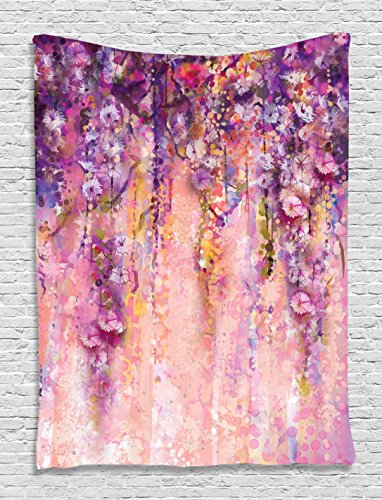 Floral Tapestry Spring Flowers Decor by Ambesonne, Wisteria Blossoms Watercolor Painting Effect Bubble Design, Bedroom Living Room Dorm Accessories Wall Hanging Tapestry, Purple Navy Blue Ivory Lilac