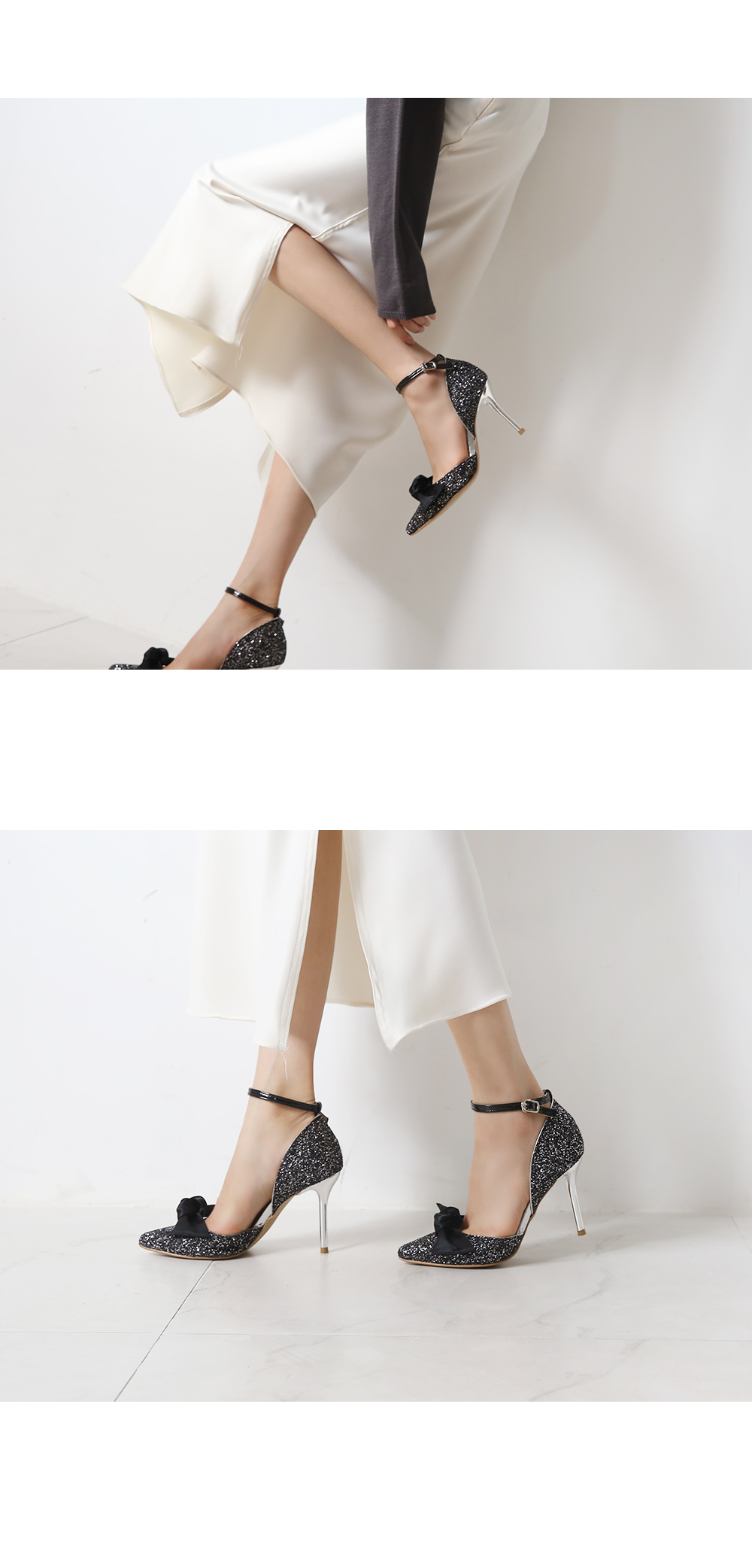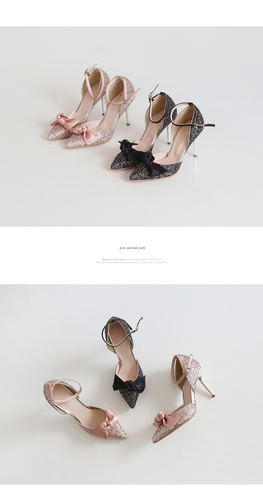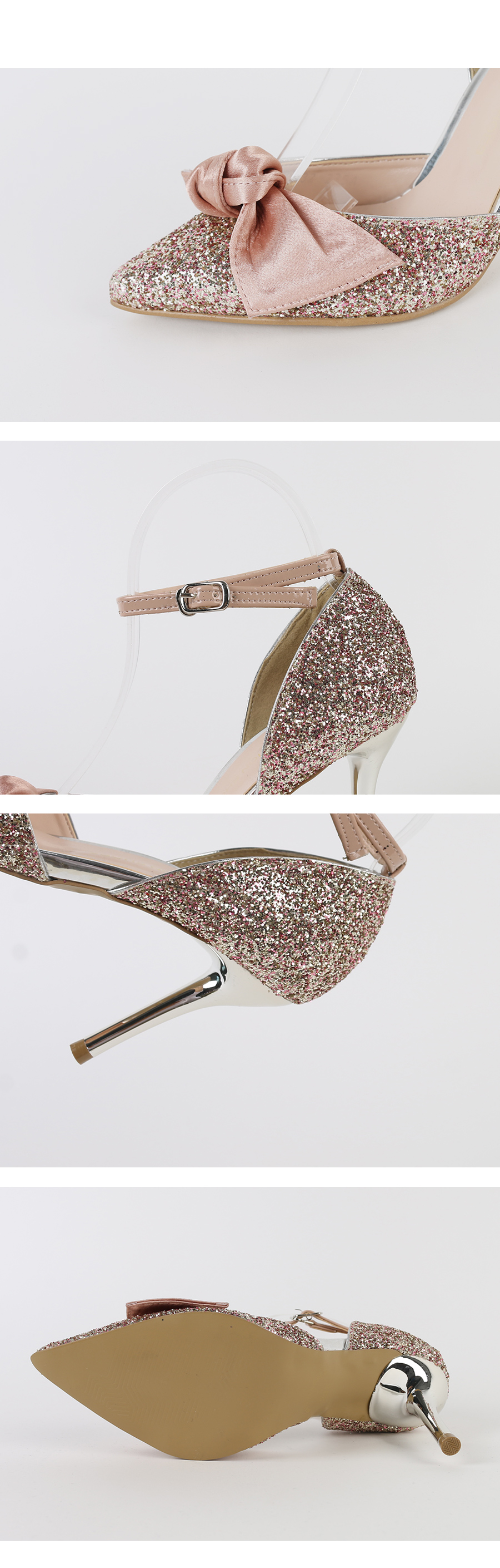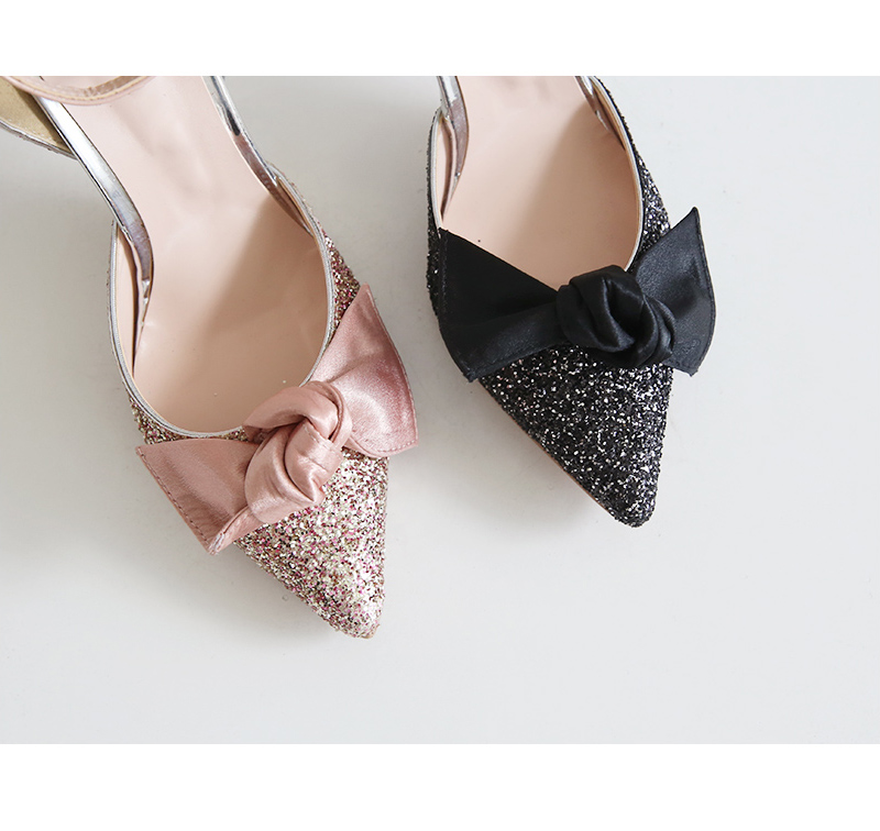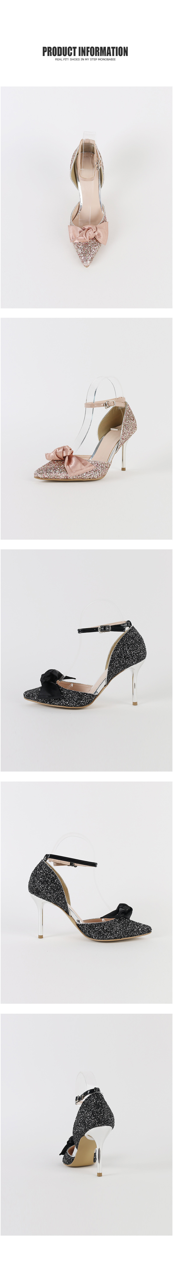 DETAILS - 소재 : 글리터 새틴 메탈굽 - 컬러 : pink,black - 피팅감 : 정사이즈 / 무게 : 보통인편 - 착화감 : 편안한 편이에요:) - 모델피팅 : 235