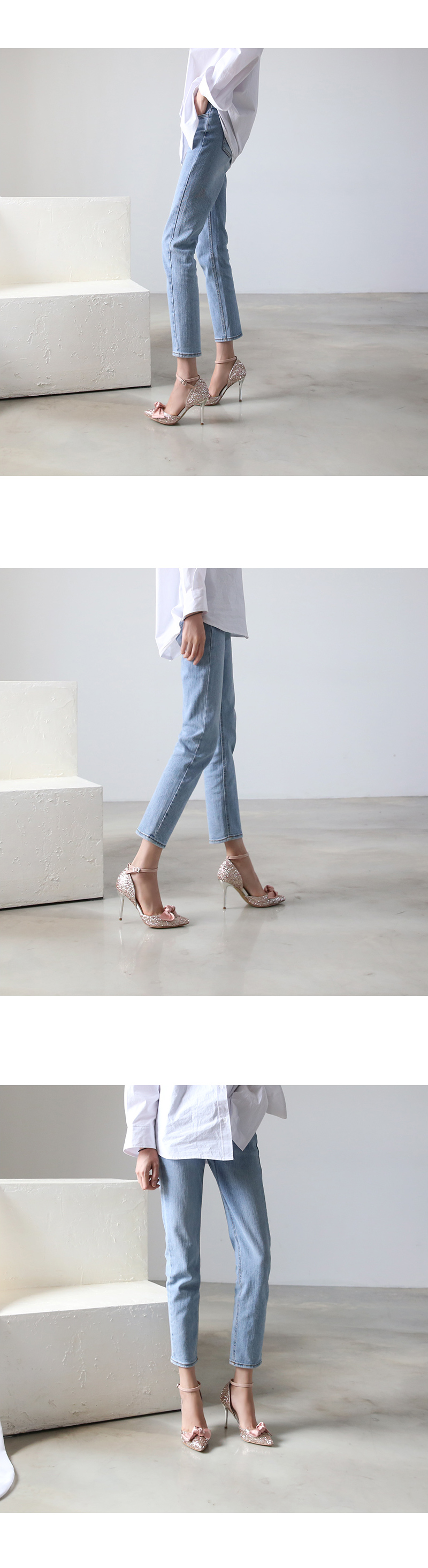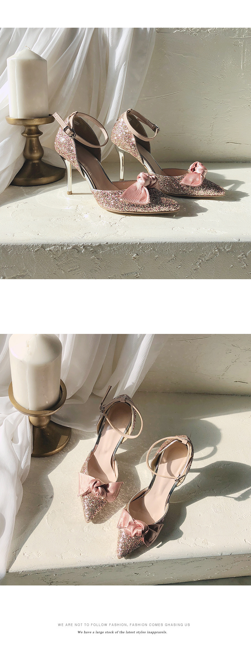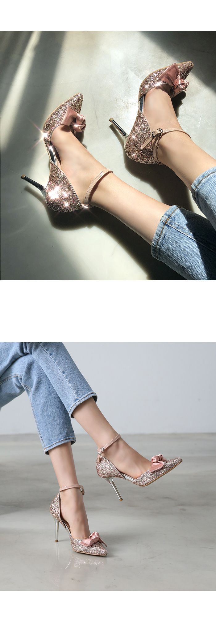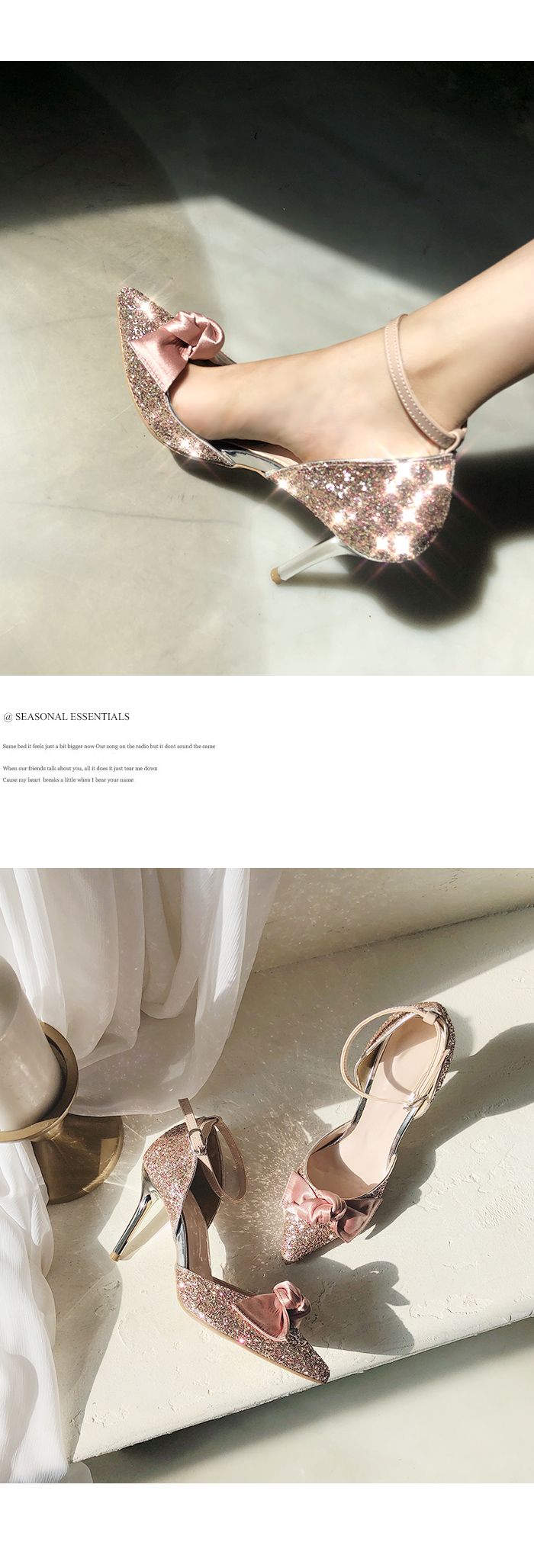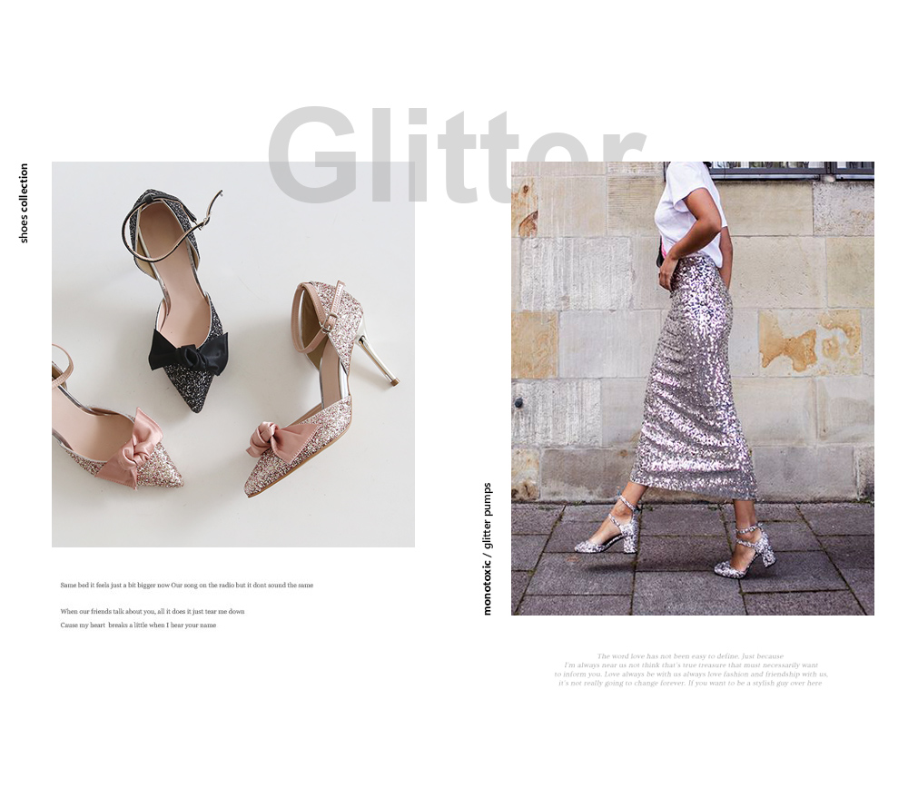 DETAILS - 소재 : 글리터 새틴 메탈굽 - 컬러 : pink,black - 피팅감 : 정사이즈 / 무게 : 보통인편 - 착화감 : 편안한 편이에요:) - 모델피팅 : 235
