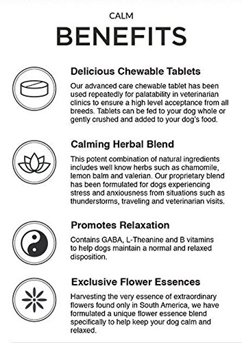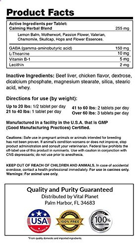 -. Binding : Misc. -. Brand : Vital Planet -. EAN : 0850964006002 -. Feature : Formulated To Promote Relaxation and Calmness in Stressful Situations / PROMOTES RELAXATION Contains GABA, L-Theanine and B vitamins to help dogs maintain a normal and relaxed disposition. / CALMING HERBAL BLEND This potent combination of natural ingredients includes well know herbs such as chamomile, lemon balm and valerian. Our proP.R.Ietary blend has been formulated for dogs experiencing stress and anxiousness from situations such as thunderstorms, traveling and veterinarian visits. / EXCLUSIVE FLOWER ESSENCES Harvesting the very essence of extraordinary flowers found only in South America, we have formulated a unique flower essence blend specifically to help keep your dog calm and relaxed. / DELICIOUS CHEWABLE TABLETS Our advanced care tablet has been tested repeatedly for palatability in veterinarian clinics to ensure a high level of acceptance from all breeds. Tablets can be fed whole or gently crushed and added to your dog's food. -. Label : Vital Planet -. Manufacturer : Vital Planet -. Model : 14000 -. MPN : 14000 -. PackageQuantity : 1 -. PartNumber : 14000 -. ProductGroup : Pet Products -. ProductTypeName : PET_SUPPLIES -. Publisher : Vital Planet -. Size : 60 -. Studio : Vital Planet -. Title : Vital Planet - Calm for Dogs - Natural Support for Calmness and Relaxation in Stressful Situations for Dogs - 60 Chewable Tablets -. UPC : 850964006002
