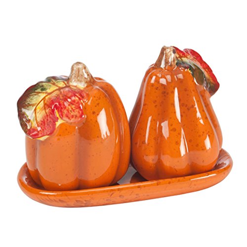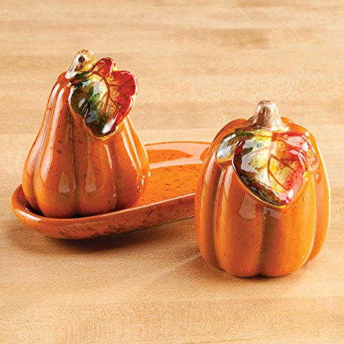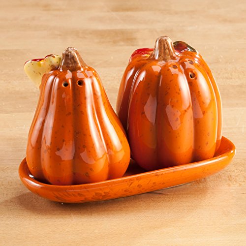 Studio : Miles Kimball Publisher : Miles Kimball Product Description Lending harvest style to your tabletop, these Ceramic Harvest Pumpkin Salt Pepper Shakers with Tray are crafted of handpainted ceramicnestled conveniently on their own little tray. Detailed all around like your favorite collectibles, the unique salt and pepper shakers fit comfortably in your hand, easily delivering that perfect shake of salt and ground pepper. Ceramic salt and pepper shakers feature rubber stoppers for easy filling; hand wash. Pumpkins: 3" high x 2 1/2" dia. Tray: 5" long x 3" wide. 0