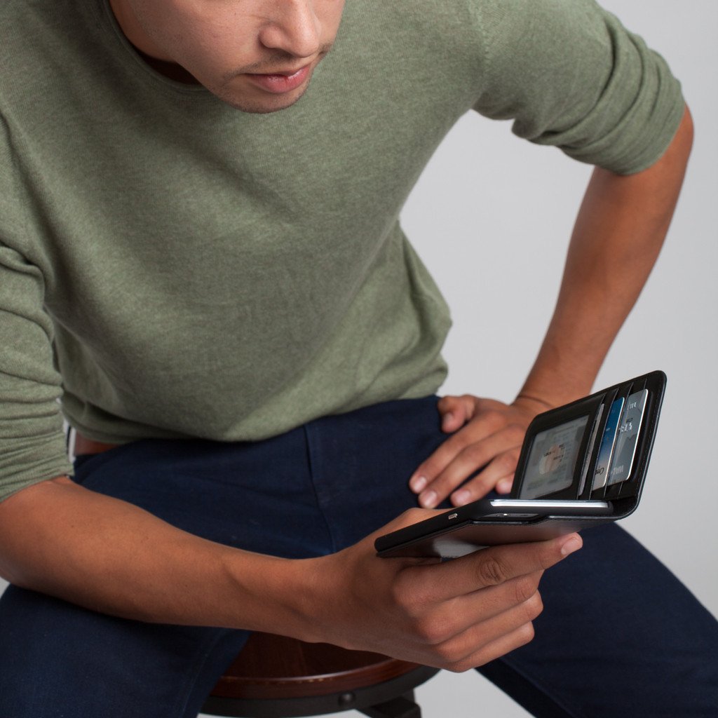 On the back side of the flip (lid) part, banknotes etc. can be stored in multiple cards and pocket of further inner part.