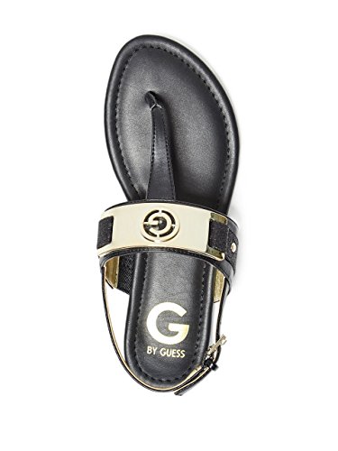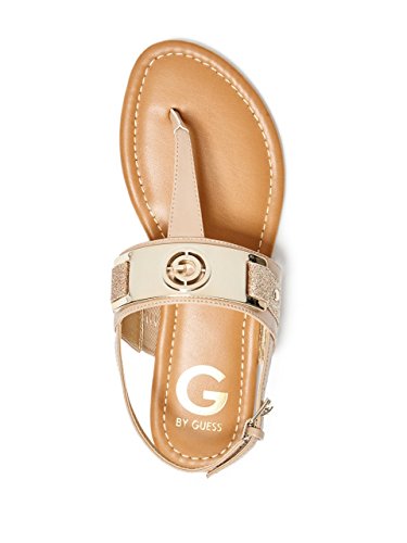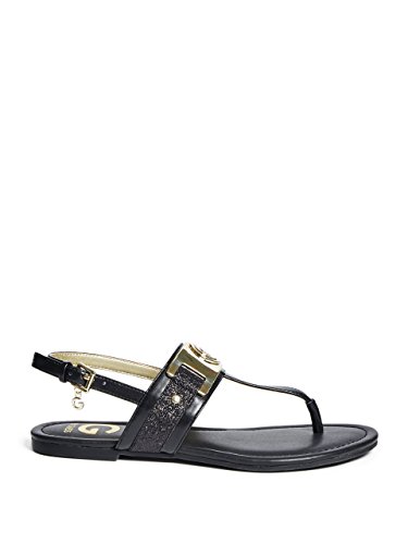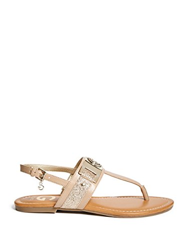Studio : GByGUESS Publisher : GByGUESS Binding : Apparel Product Description Add glamour to your casual days with these t-strap sandals featuring glitter panels and gold-tone logo vamp. Finished with a cushioned insole and an adjustable ankle strap with buckle closure. 0