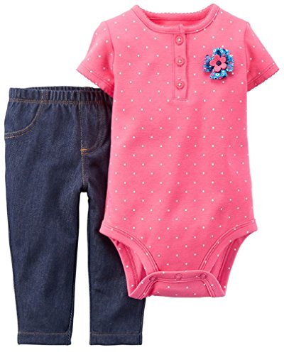 -. Feature : 2-piece set includes: bodysuit & jeggings / Bodysuit: crewneck, 3-button placket, short sleeves, inseam snaps / Jeggings: no-pinch elastic waistband / Sweet pindot pattern adorns bodysuit; Rosette accent; Denim-look jeggings keep her look on trend / Denim-look jeggings keep her look on trend