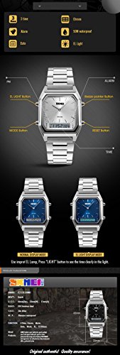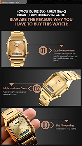 -. Feature : 164FT WATERPROOF: 164 ft waterproof (50 M) - 5ATM water resistant. NOTE: please DO NOT press any buttons in the water. / DUAL DIAL TWO TIMEZONE: analog and digital dual dial support two different timezone. Shock resistant, stop watch, military 12H/24H time, and LED back light functions make it perfect for all kind of sport and daily use. / COMFORT with FASHION: silicon rubber watch band with the large dual dial design make it comfortable to wear and lead you to edge sport fashion. Perfect for both indoor and outdoor activities. / MULTI-FUNCTIONAL: Dual Timezone, Calendar Day and Date, Alarm, Water Resistant, LED Display, Back Light, Shock Resistant, Stop Watch.