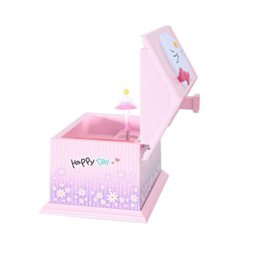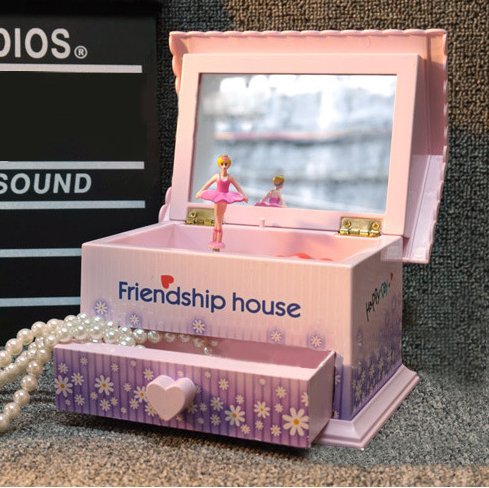 Feature : Features in the shape of a jewelry box, and contains a dancing ballerina girl / With two cabinets and a drawer to put small jewelry / No need battery, just wind up the spring by hand and open the upper cover to play music / As music plays, the ballerina girl will dance. A small mirror in the box / Note: The pearl necklace not included.