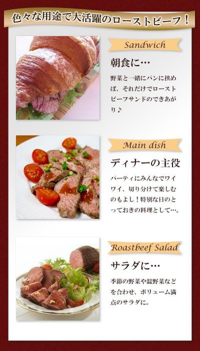 | セット内容 | ・赤ワイン仕立てローストビーフ(AUS) 200g×6パック ・玉ねぎソース 20g×6パック ・レホール 3g×6パック ・説明書×1 |