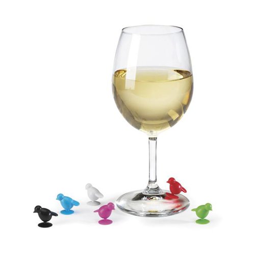 Six bird wine charms, one each of blue, fuchsia pink, green, black, white and red. Simply press and they suction on the base of the wine glass.