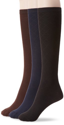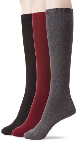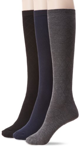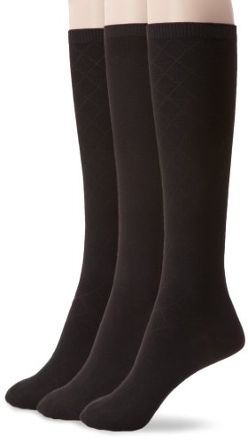 Nine West Women's Textured Diamond And Solid Flat Knit Knee High 3 Pair Sock, Black, Size 9-11
