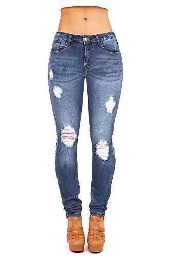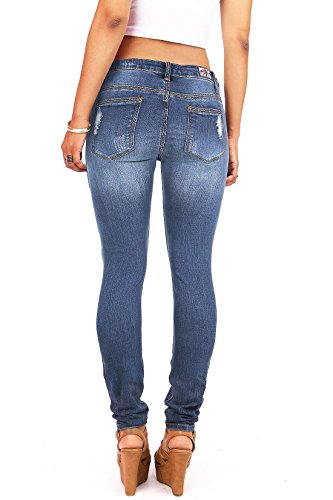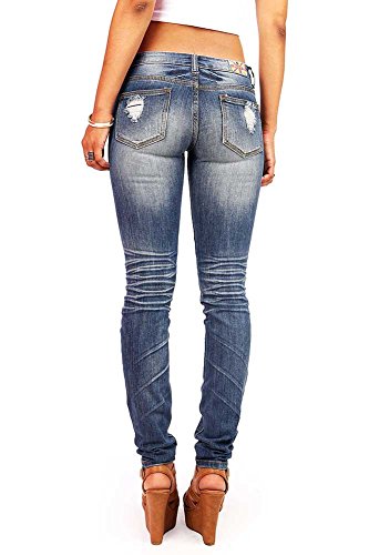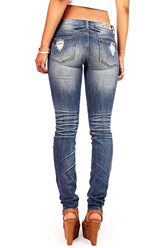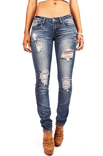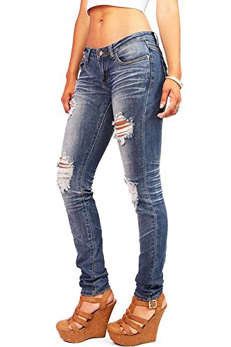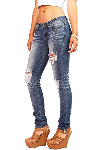 Product DescriptionLow rise destroyed skinny jeans with a button and zip fly front. Slightly faded wash down the center with crinkled designs behind the knees and traditional 5 pockets. Juniors sizing.0