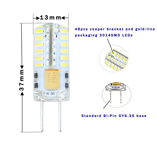 Instant-on to full brightness, no flicker, no buzzing sound. Standard Bi-Pin GY6.35 base (Length of pin is 9.8mm,Distance between two pins is 6.35mm)