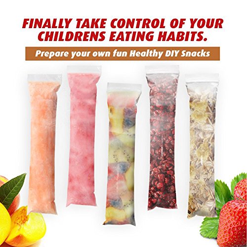 PERFECT SIZE: These ice pop bags is 2.4 inch wide, 8.6 inch long, so easy to add fruit, chopped vegetables, seeds, candy, yogurt, granola, oat, dark chocolate, honey, nuts and pretty much anything that comes to mind.To be enjoyed at parties, BBQ's, picnics, poolside, sports events, after school or lunchboxes treats.