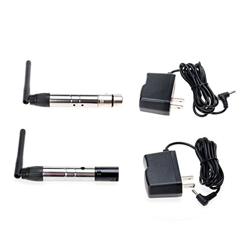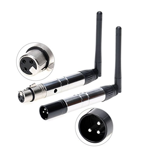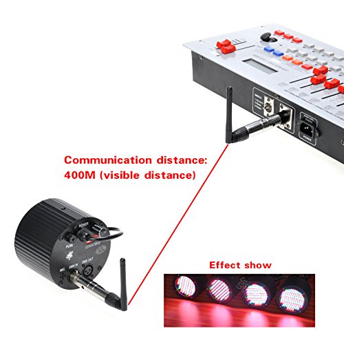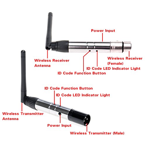 relationship: 1:RED 2:GREEN 3:RED GREEN 4:BLUE 5:RED BLUE 6:GREEN BLUE 7:RED GREEN BLUE 1. Press momentary switch above the side led indicator to indicate ID setting 2. Press again to set IC,to the color ID desired,adding 1 each time you press the switch will advance the color ID code. 3. Working condition: LED constant lit up:No DMX or wireless signal. Red LED flash:Transmitting. Green LED flash:receiving 4. RF frequency 2.400 - 2.525G,total 126 channels,it's searching automatically, 5. ID Code "1-7" groups ID code,press 'KEY' for setting,it only can work under same ID code of transmitter and receiver. (Same LED Color) This unit is for Indoor use only Packing list: 2x DMX512 wireless receiver/transmitter unit 2x 5V adapter 0