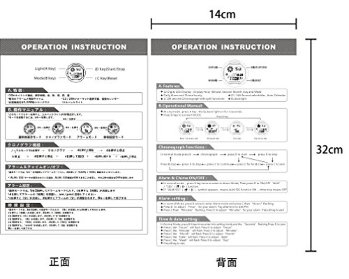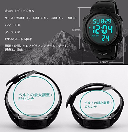 -. Feature : 多用:耐衝撃性、ストップウオッチ、24時間制、LEDバックライト付き、お仕事でも日常でも気軽に使えます。 / 機能:日付/曜日/カレンダー、アラーム、防水、LED表示、バックライト、防衝撃、ストップウオッチ / 防水:164フェット/50メートル防水、シャワー、手洗い、水泳、ダイビングなどの場合で適用です。(水中で防水腕時計のボッタンを抜かないでください。) / サイズ:時計の直経:50mm  厚み:1.4mm 長さ:250mm バンドの長さ:250mm(調節できる) 時計の重さ:約54g / セットの内容;1*スポーツ デジタル腕時計、1*取扱説明書