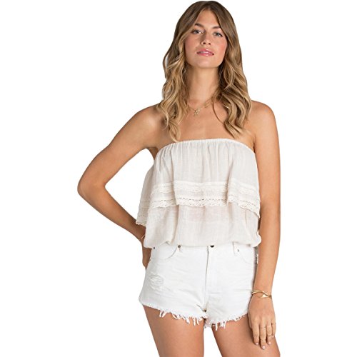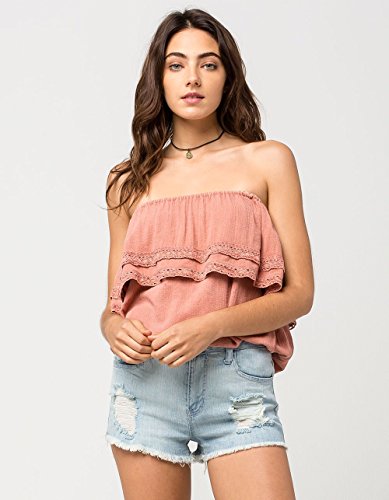 Woven gauze top with crochet trim on self ruffle and elastic at hem. And neck. Can be worn two ways, off the shoulders or as a tube top.