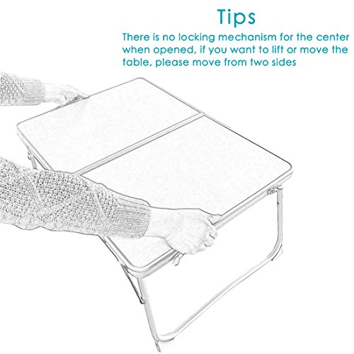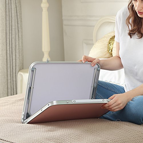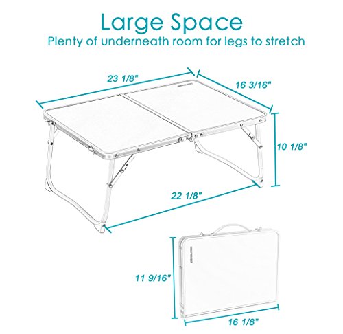 -. Feature : MULTIFUNCTIONAL LAPTOP DESK - It can be used as a laptop desk, bed tray, bed table, breakfast serving bed tray, book stand and picnic table etc.. Perfect for working, playing, reading, snacking and camping / SPACIOUS ROOM - Unfolded size: 23.2"x 16.1" (Perfectly fits a 16" laptop with extra mouse space); Folded Size: 11.6" x 16.1", height: 1.6" (An inner room for store a book/mouse pad) / LIGHTWEIGHT AND PORTABLE - Lightweight but quite sturdy, it folds up nicely, has locking clasps and a handle to make the camping table portable / STURDY ENOUGH - Sturdy aluminum alloy frame with supporting buckle, non-slip design on the bottom. Max load: 66 lbs (30 kg) / TIPS - The bed tray is featured in foldable tabletop, without a locking mechanism for the center fold when in an open position. If you want to move the table, please move it from both sides (with handles) instead of the middle place
