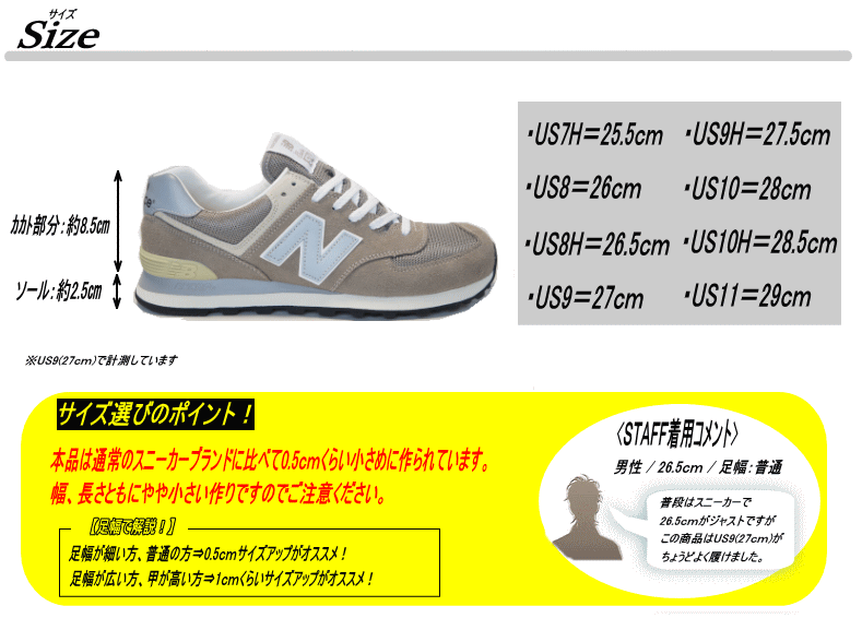 | サイズ | 作り⇒やや小さめ 【サイズ選びのポイント!】 足幅が細い方、普通の方⇒0.5cmくらいサイズアップがオススメ! 足幅が広い方、甲が高い方⇒1.0cmくらいサイズアップがオススメ! |