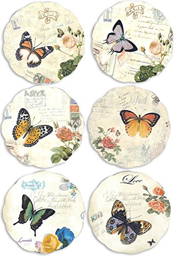 - SET of 6 DECORATIVE COASTER WITH HOLDER SET each with a unique colorful butterfly and pink rose flowers theme design. Features vintage accents of European city landmarks of Paris and London. Old Fashioned post card style with stamps.