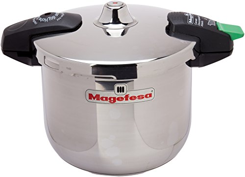 This super fast pressure cooker is made from 18/10 stainless steel. Two pressure levels: Fast cooking: 10 psi. and super fast cooking: 15 psi. Stainless steel cooking surface does not react with food or alters flavors and is stick resistant. Five safety features incorporated to lid: safety-lock handle, visual pressure indicator, pressure regulating valve, safety overpressure valve and safety window at the edge of lid. Easy lock button on handle makes it easy to use while adding safety during handling.Feature