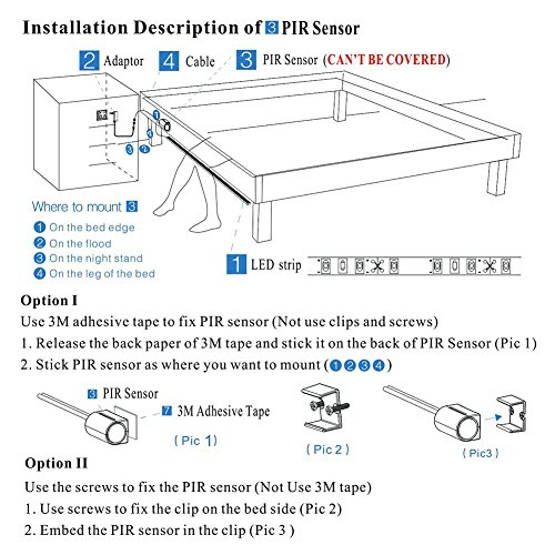 - 5ft Smart Bed Light -- Warm soft glow of bed light will turn on to guide you safely across the room in the dark, no disturbing glare to wake others; Only light up when it picks up your movement, auto shut-off after leaving, further improve power efficiency and save energy. The strip light is long enough to cover one side of bed or down the middle, and it can be cut to fit the desired size of beds.