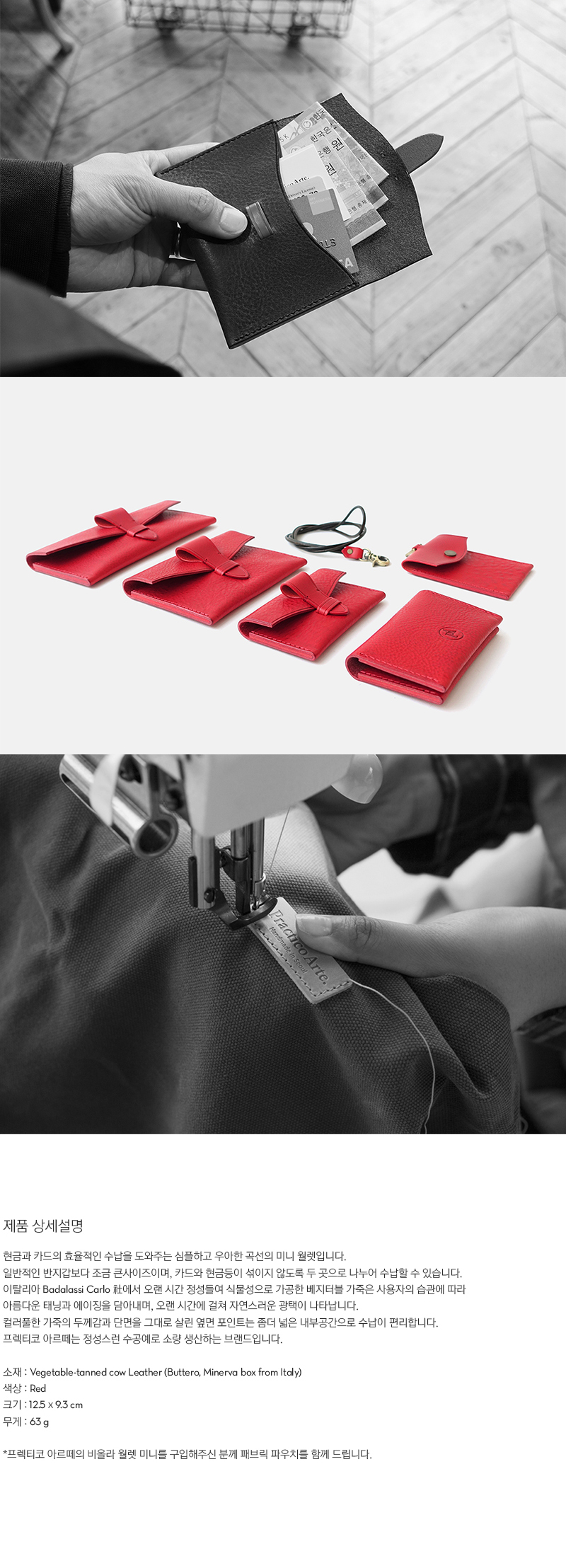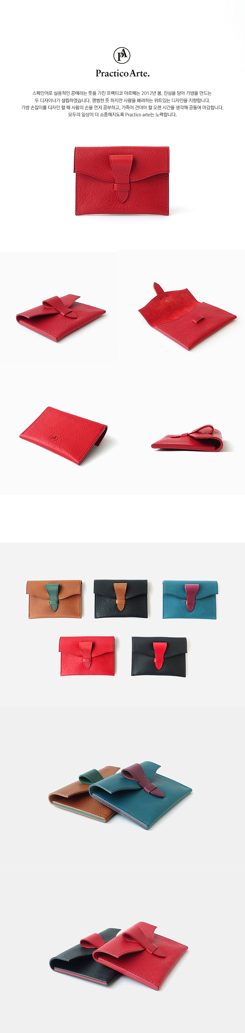 | 현금과 카드의 효율적인 수납을 도와주는 심플하고 우아한 곡선의 미니 월렛입니다. 일반적인 반지갑보다 조금 큰사이즈이며, 카드와 현금등이 섞이지 않도록 두 곳으로 나누어 수납할 수 있습니다. 이탈리아 Badalassi Carlo 社에서 오랜 시간 정성들여 식물성으로 가공한 베지터블 가죽은 사용자의 습관에 따라 아름다운 태닝과 에이징을 담아내며, 오랜 시간에 걸쳐 자연스러운 광택이 나타납니다. 컬러풀한 가죽의 두께감과 단면을 그대로 살린 옆면 포인트는 좀더 넓은 내부공간으로 수납이 편리합니다. 프렉티코 아르떼는 정성스런 수공예로 소량 생산하는 브랜드입니다. |