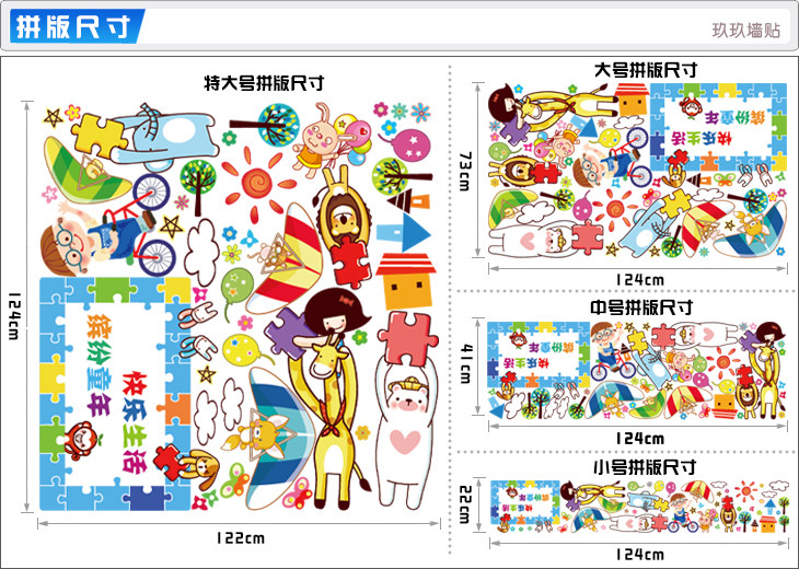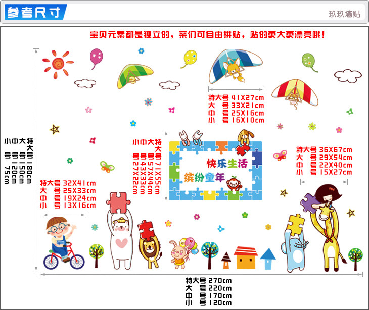 大尺寸幼儿园卡通墙贴儿童娱乐城许多小动物拼图气球自行车贴纸画